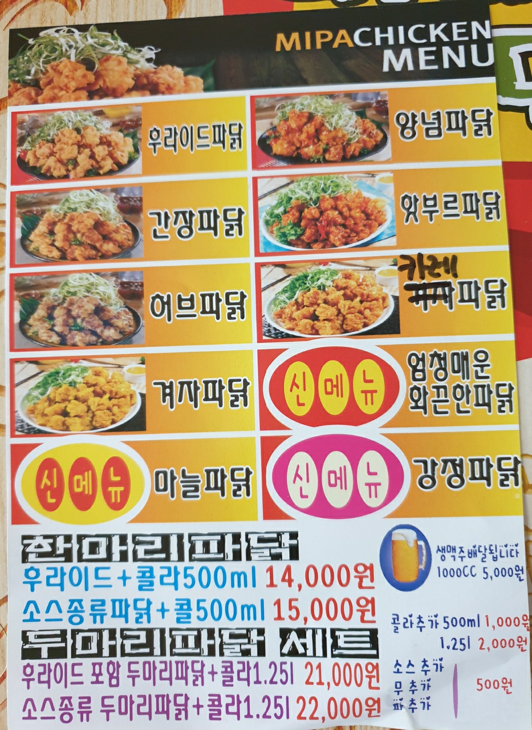 미쳐버린 파닭 메뉴입니다. 저는 양념파닭, 마늘파닭, 강정파닭, 간장파닭을 먹어봤는데 그중 간장파닭이 제일 맛있었습니다.